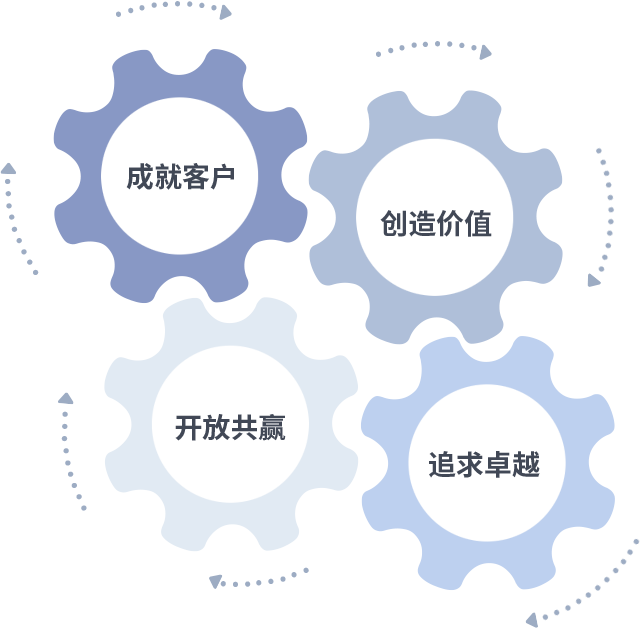 成就客户是一切决策的出发点,,创造价值是衡量所有工作的标准,,,追求卓越是我们做事做人的态度,,,开放共赢是我们的格局也是最终的结果。。。。价值观的齿轮环环相扣,,推动着组织里的每个人不断向前。。。。